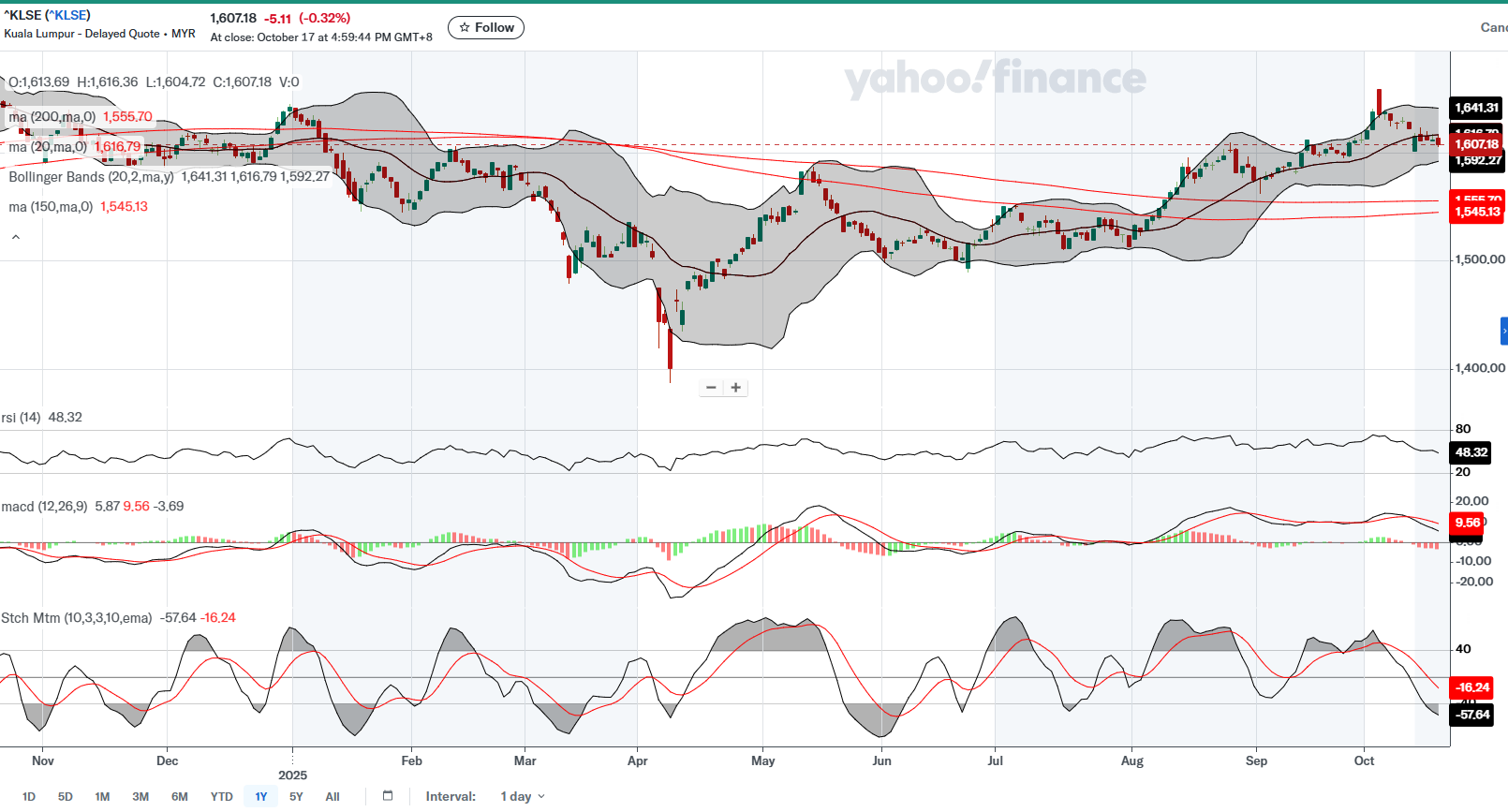 The technical setup of the KLCI chart is currently Slightly Bullish. The index remains in a medium-term uptrend, holding above the 150-day and 200-day moving averages (around 1,545–1,555), but recent price action shows weakening momentum after the sharp rally toward 1,640. The Bollinger Bands indicate c…